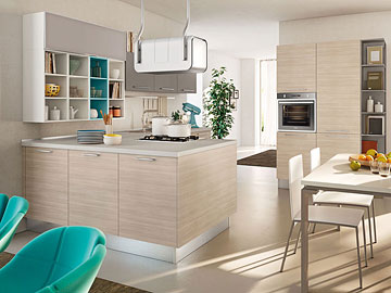 Le cucine moderne Lube sono solari nella scelta delle tonalità, prediligono le essenze naturali di rovere, noce e ciliegio e il laminato bianco.