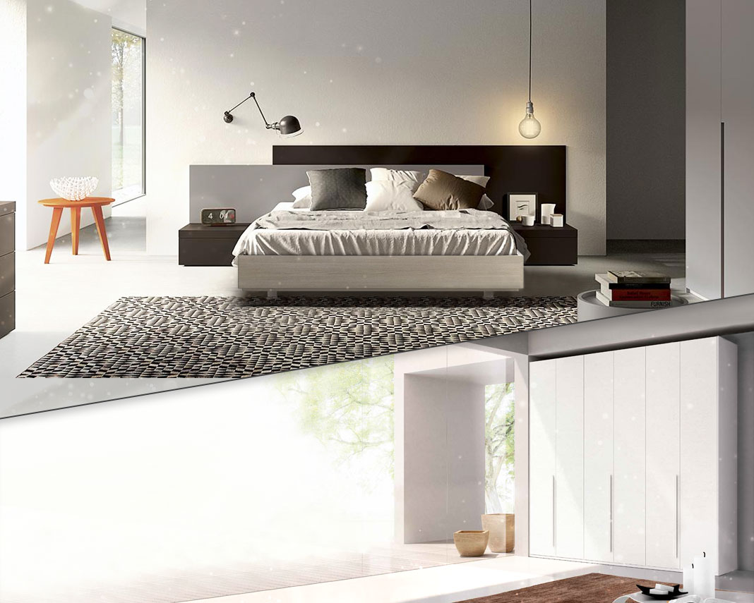 Camera in melaminico completa di: 1 armadio a 6 ante battenti da cm. 272,8 x 59 H=259 completo di cassettiera interna, tubi appendiabiti ed 1 ripiano centrale per ogni elemento; 1 testiera a pannelli MOOD colorati o legno sfalzati con larghezze variabili tra cm. 280 e cm. 310; 1 Letto completo di rete ortopedica; 2 comodini con apertura ammortizzata da cm. 45; 1 comò da cm. 120 a 3 cassetti.