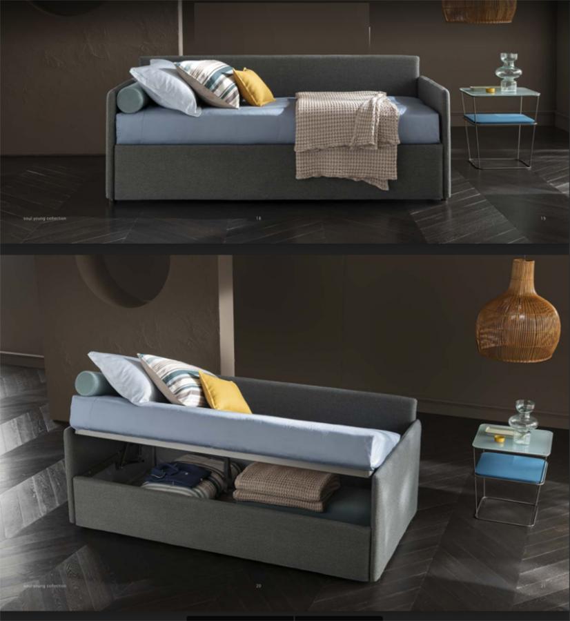 Letto singolo a divanetto con molteplici possibli soluzioni estetiche.