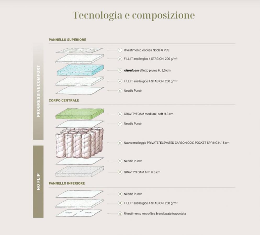 E' un materasso pensato per le 4 stagioni attraverso l'uso di materiali climatizzati (FILL IT) che quindi sono adatti sia per i periodi freddi invernali che caldi estivi